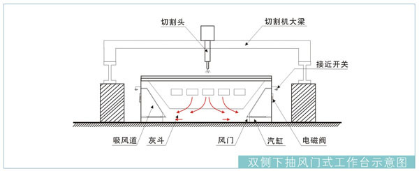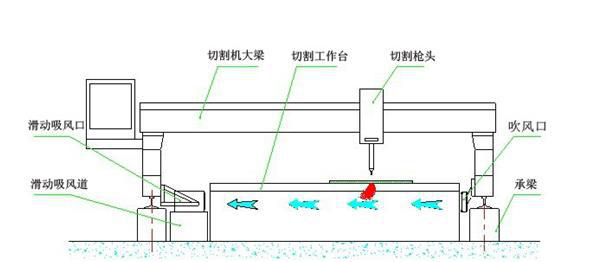 含塵氣體經(jīng)過(guò)切割平臺(tái)-→切割平臺(tái)內(nèi)部的單側(cè)吸風(fēng)道-→排塵主管道-→除塵器-→潔凈達(dá)標(biāo)空氣排出