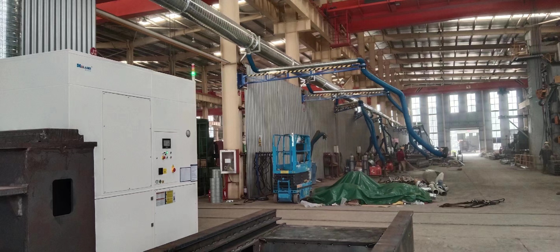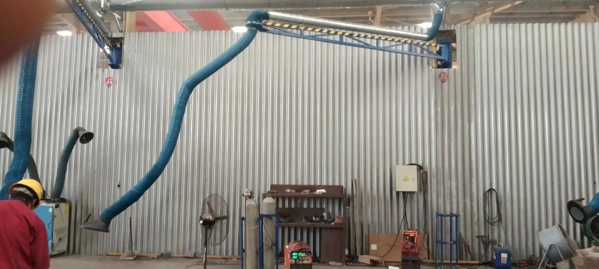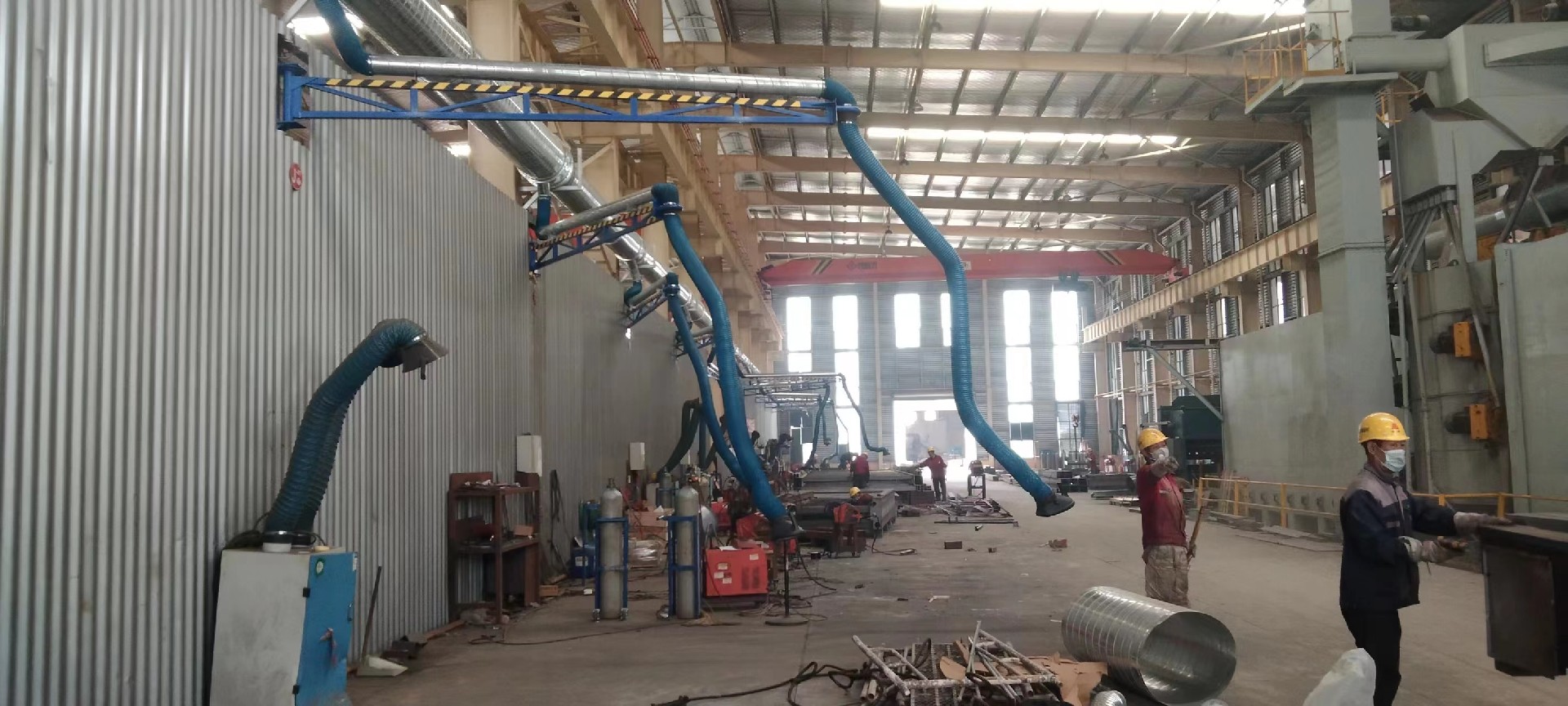工位分布均勻且跨度不大的人工焊接工況可用懸臂式除塵每個焊接工位所產(chǎn)生的煙塵都能在產(chǎn)塵點得到有效的吸收,不會污染車間的其它地方。吸氣臀的骨架類似于人的手臂,能夠在一定長度范圍內(nèi)的空間懸停。吸氣臂的外層為耐高溫軟管,不僅能夠防止火花飛濺燙傷軟管,同時軟管結(jié)構(gòu)又保證了吸氣臀的移動靈活性。在吸氣罩的位置上設計了獨特的旋轉(zhuǎn)機構(gòu),保證了吸氣罩能夠通過任意方位對準焊接位置,使吸氣臂能夠有效捕捉焊接過程中產(chǎn)生的煙塵。吸氣臀捕捉的好處是可以接近煙塵產(chǎn)生部位,采集效果較好。