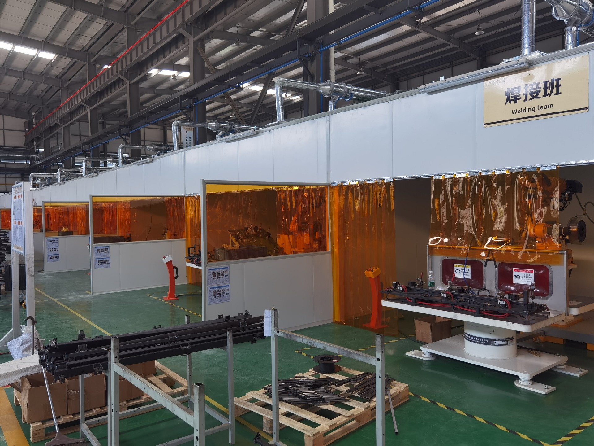 現(xiàn)場車間共有8個焊接工作站需要煙塵凈化處理,在焊接工裝平臺中心處,安裝遮擋弧光的軟膠簾,膠簾從離地面2米高度垂下,膠簾下擺根據(jù)工裝平臺的形狀仿形剪切,下擺距離工裝或地面縫隙不大于10mm,膠簾交錯層疊安裝,兩條膠簾之間的層疊區(qū)長度不低于30mm;使焊房處于相對密閉的空間,焊接煙塵不外溢。各焊房上料區(qū)之間安裝隔斷墻,隔斷墻腰線高度1米,腰線以下采用凈化板材質(zhì),腰線以上采用金屬框架和半透明擋光材料。各焊房上料區(qū)有獨(dú)立的空間,并且保證了外觀的整齊劃一。