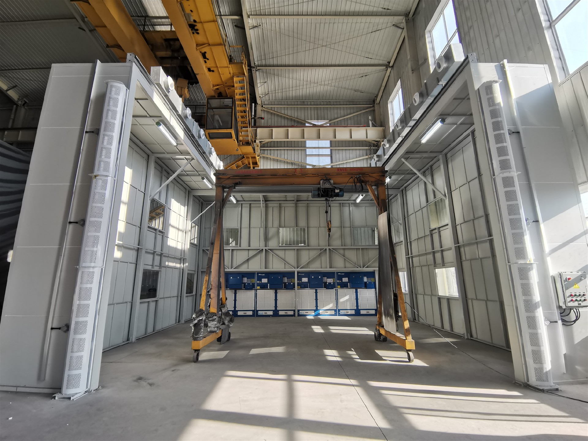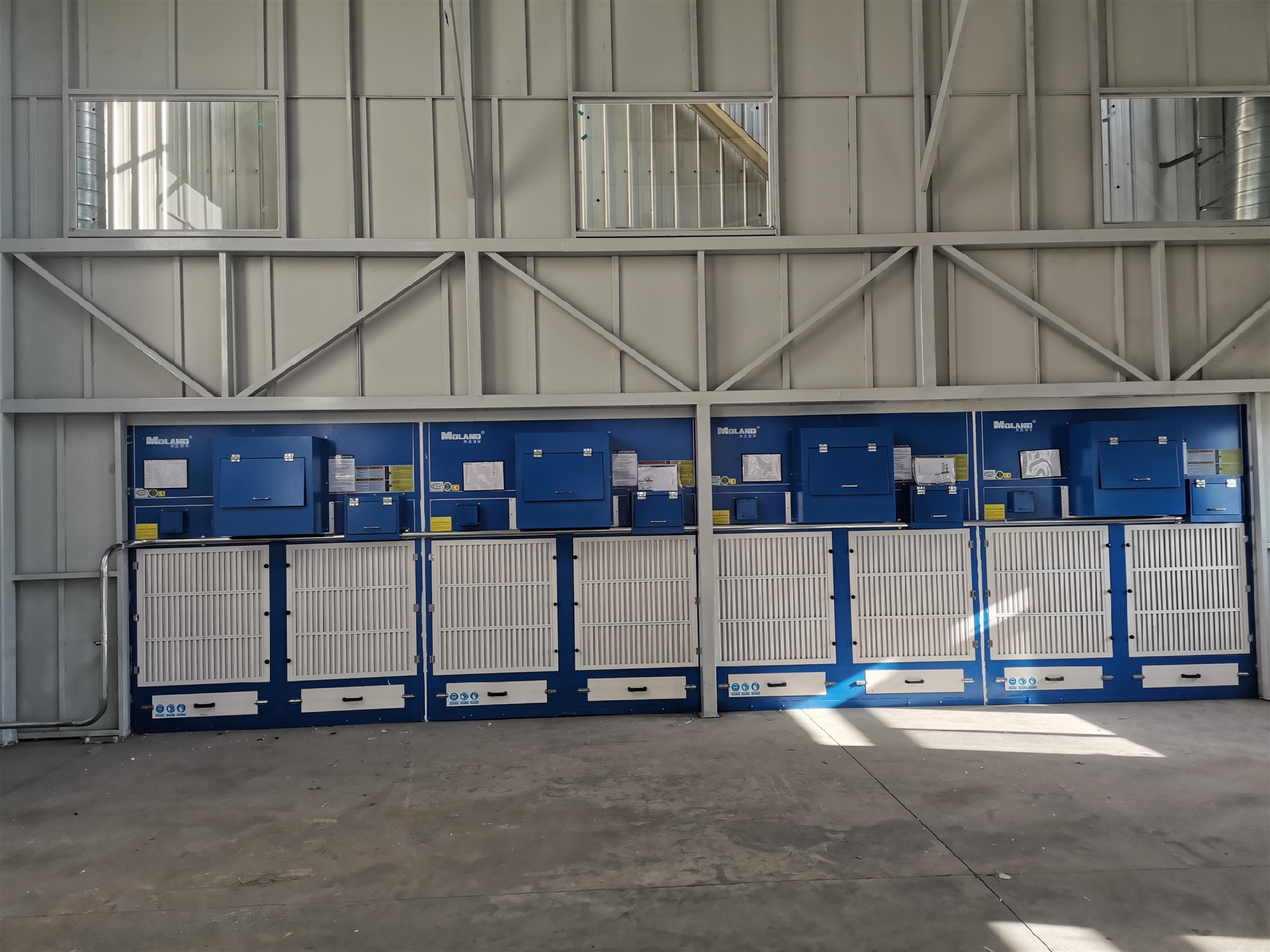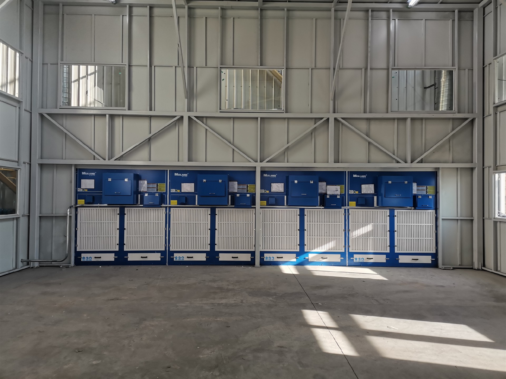 科技美藍(lán),智慧除塵,大家好,今天給大家分享大型工件打磨拋光產(chǎn)生的粉塵怎樣處理?這是我們?yōu)槟衬茉囱b備生產(chǎn)企業(yè)鈦合金打磨車間設(shè)計(jì)制作的防爆無塵打磨除塵系統(tǒng),客戶現(xiàn)場(chǎng)打磨工件比較大,需要行車吊裝工件,且打磨時(shí)粉塵量比較大,了解具體工況及跟客戶溝通后,采用美藍(lán)環(huán)保4臺(tái)防爆款打磨除塵柜+打磨房的處理方式,打磨房尺寸10m(長(zhǎng))*10m(寬)*6m(高),鋼結(jié)構(gòu)整體框架,防腐蝕龍骨搭建,板材選用碳鋼噴塑鈑金材質(zhì),在房頂兩側(cè)加裝送風(fēng)管道,凈化后的空氣通過管道進(jìn)入射流口吹到房間里,實(shí)現(xiàn)空氣內(nèi)循環(huán)。并在房頂加裝一個(gè)可伸縮的電動(dòng)天幕,吊裝工件的時(shí)候收縮,作業(yè)的時(shí)候可打開覆蓋房間。為達(dá)到良好的送風(fēng)效果,在門口兩側(cè)各加裝風(fēng)幕,形成一個(gè)無形的門簾,防止粉塵不外溢。